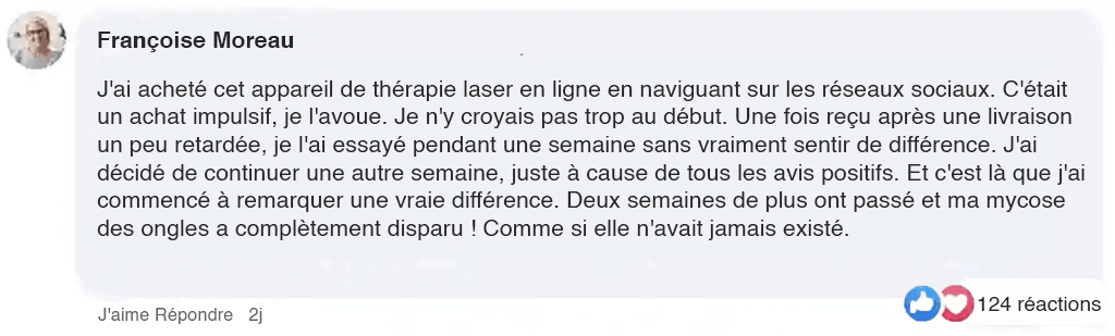 Et croyez-moi, cela a tout changé ! Après seulement quelques semaines, j'ai commencé à remarquer une vraie différence. Mes ongles ont commencé à paraître plus clairs, l'épaisseur a diminué et la douleur s'est progressivement estompée. Aujourd'hui, je peux dire avec fierté que mes ongles sont plus sains qu'ils ne l'ont été depuis des années. Je n'ai plus peur de mettre des chaussures ou de montrer mes pieds en public. Cet appareil a vraiment transformé la santé de mes ongles, et je ne pourrais pas être plus heureuse. Il m'a redonné espoir pour un avenir où je n'aurai plus à m'inquiéter de la mycose. Merci OnglePur ! »