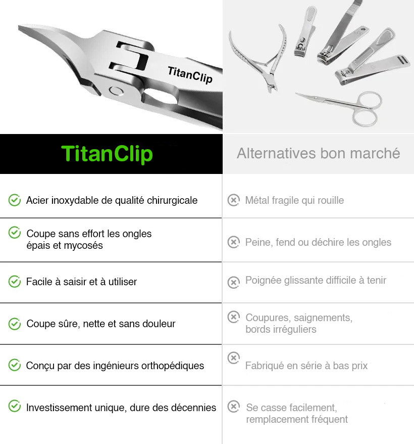 Contrairement aux coupe-ongles ordinaires, TitanClip a été spécifiquement conçu pour les seniors et les personnes souffrant de pathologies unguéales.