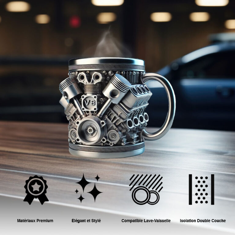 "Conçu par des ingénieurs automobiles renommés et des passionnés, le Mug V-MAXX représente l'alliance parfaite entre passion automobile et savoir-faire d'expert. Ce mug innovant capture le design iconique des légendaires moteurs V6 et V8, symboles de puissance brute, de précision et d'excellence technique.